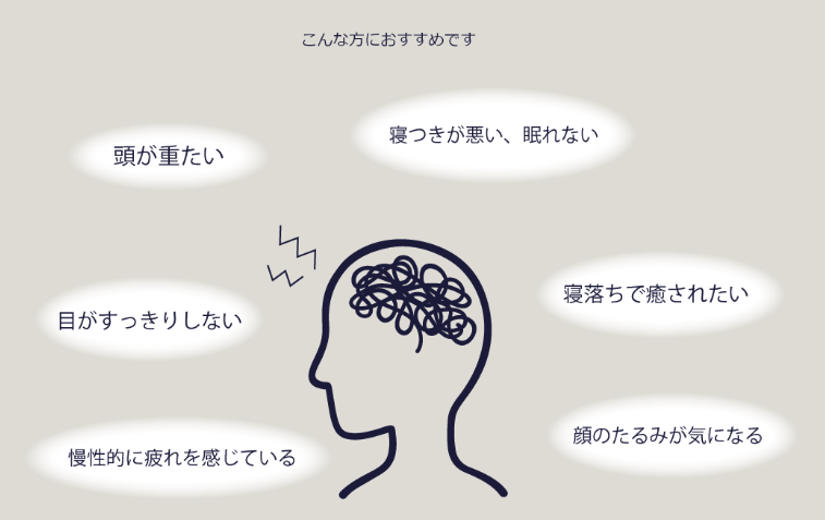 疲れ切った脳は癒されることで本来の正常な機能を回復し、自分自身で健康になる力(自然治癒力)を取り戻していきます。 脳に一番近い頭部から心地よい刺激を与えるドライヘッドスパは、脳に癒しを与え、深い眠りを導き、心身ともに健康を取り戻します。 ドライヘッドスパは、頭痛や肩こり、眼精疲労、寝つきが悪く熟睡できないような不眠や、何度も目覚めてしまうような中途覚醒、慢性的な倦怠感、ストレスによる脱毛や肌荒れ・・・などといった悩みを持つ方にお勧めです。眼の疲れがとれない、もっと頭を冴え渡らせたい 眠れない、睡眠をとっているのにすっきりしない …